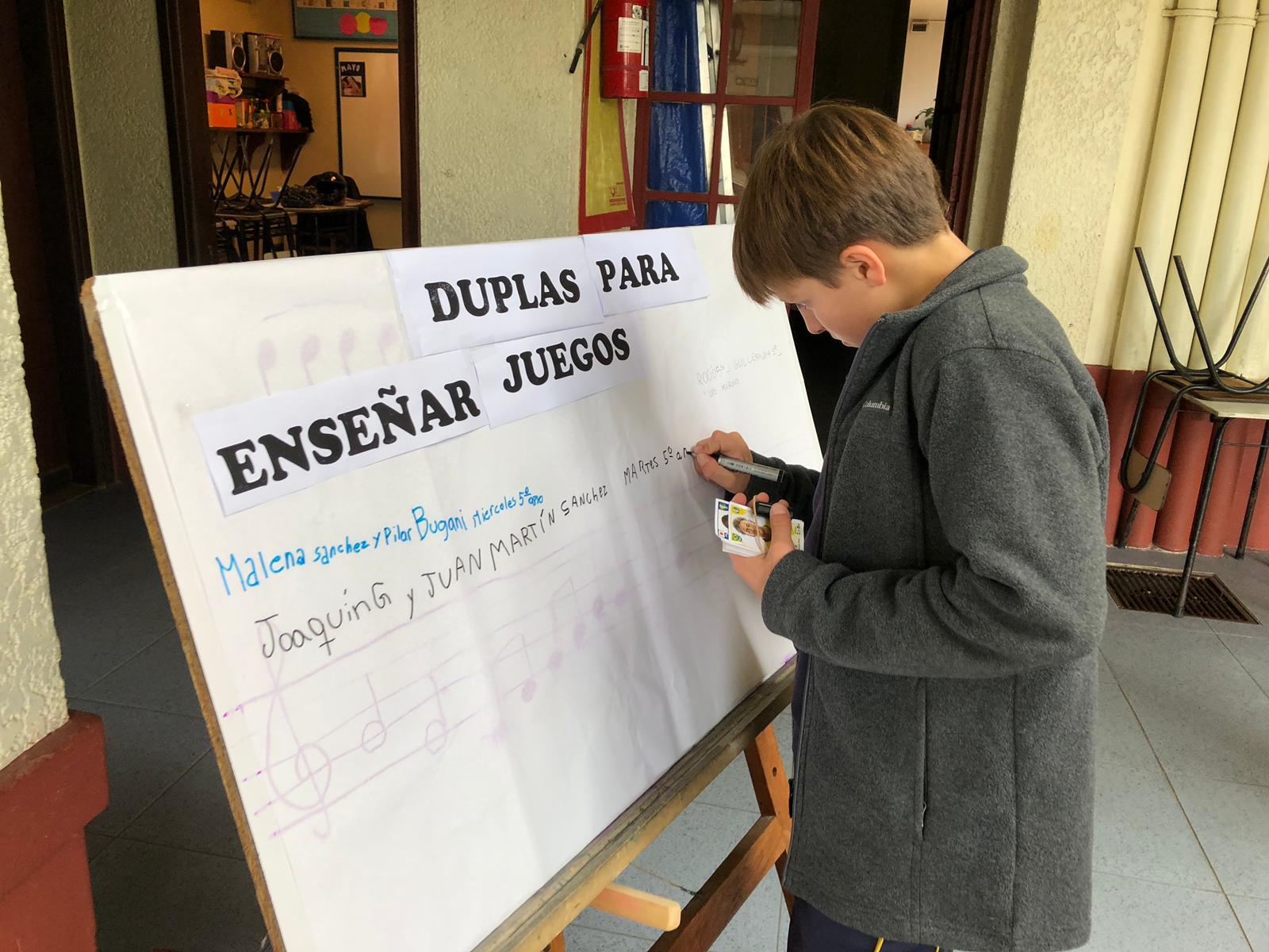 Los niños son invitados a inscribirse en duplas, como enseñantes de juegos, pudiendo anotarse en pizarrones ubicados en el patio, para luego establecer un cronograma de fechas.